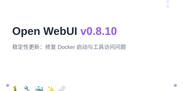 Open WebUI v0.8.10 是一个稳定性更新版本,主要修复了 v0.8.9 引入的问题,包括 Docker 启动失败、非管理员用户无法查看工具等重要 Bug。同时也新增了 MariaDB Vector 支持和 OIDC 自定义登出端点等特性。
