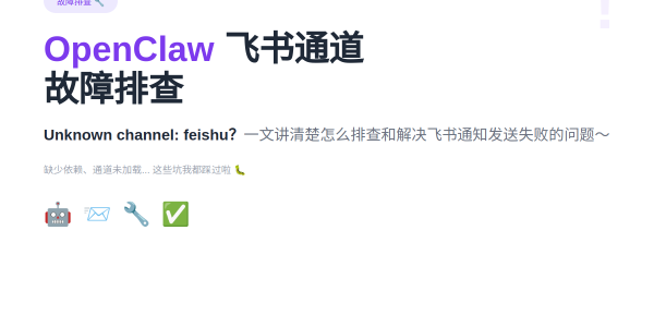 OpenClaw的cron任务飞书通知失败,报错"lark通道未配置"。排查发现配置中通道名应为feishu而非lark,修正后仍报"Unknown channel"。通过CLI测试定位到根本原因是缺少@larksuiteoapi/node-sdk依赖。安装该SDK并重启Gateway后问题解决。关键教训:遇"Unknown channel"错误时使用CLI可获取更详细错误信息,此类问题常因依赖缺失