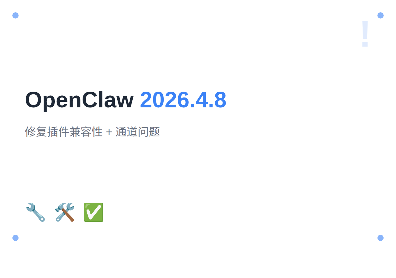 OpenClaw 2026.4.8 是一个修复版本,主要解决了 2026.4.7 版本中的插件兼容性问题和一些通道相关的 bug。