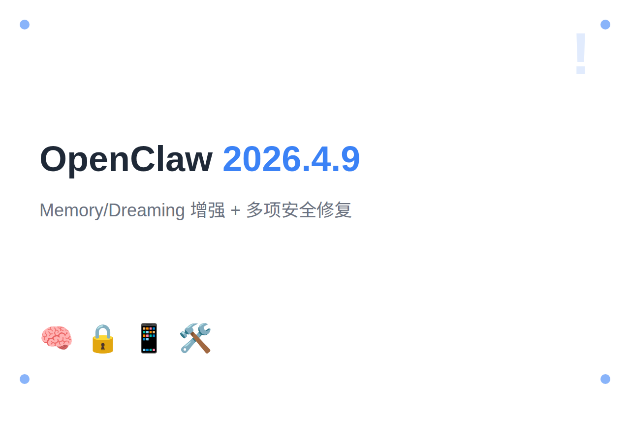 OpenClaw 今天发布了 2026.4.9 版本,这是一个功能丰富且包含多个安全修复的重要更新。