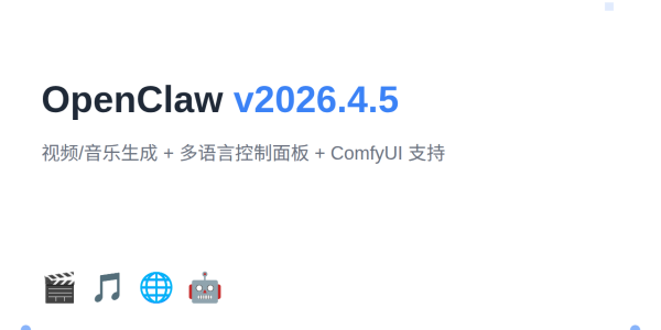 OpenClaw v2026.4.5 是一次重大更新,带来了内置的视频和音乐生成工具、ComfyUI 工作流集成、控制面板多语言支持,以及大量稳定性修复和性能改进。