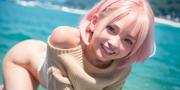 AI图像生成参数:最佳画质、真人照片风格、粉发女孩穿米色毛衣微笑特写,排除低质量及黑白效果。