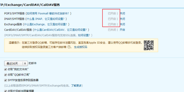 2)开启QQ邮箱 POP3/IMAP/SMTP/Exchange/CardDAV/CalDAV服务