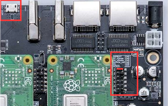用短接帽子短接扩展包上的nRPIBOOT,一般主板都会有显示。然后用数据线连接电脑。