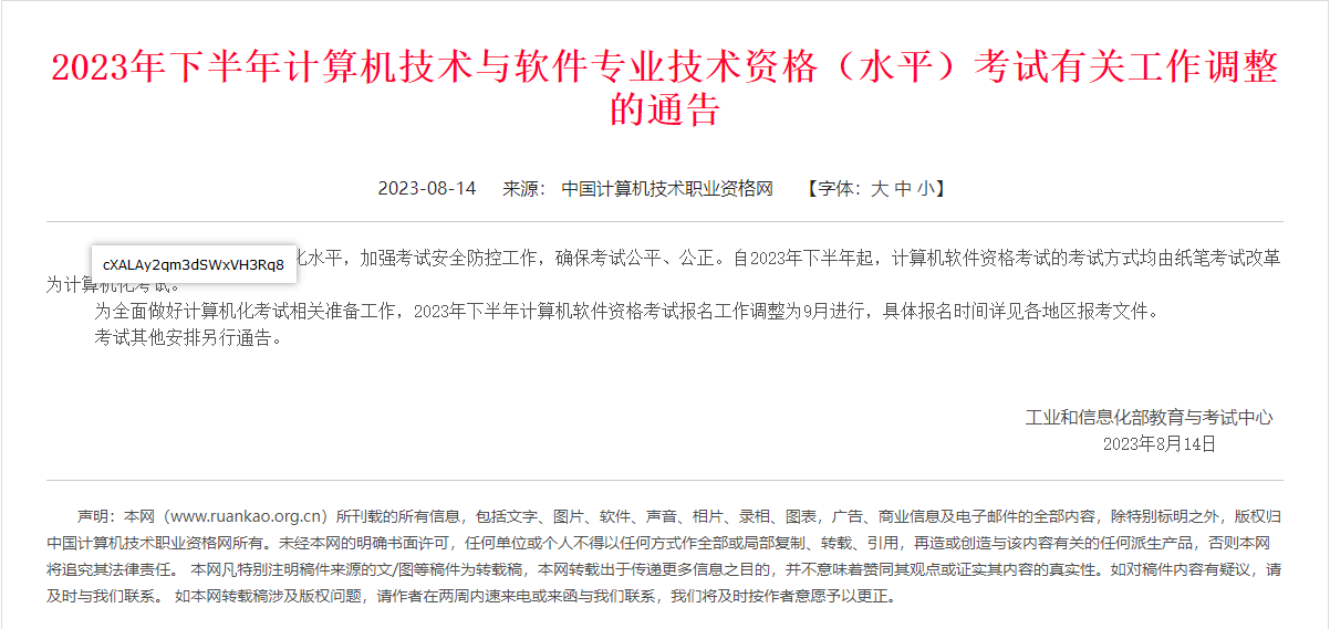 首页 笔记 计算机 软考 正文 软考 2023年下半年计算机技术与软件专业技术资格(水平)考试有关工作调整的通告 2023-09-05 2740 0 分享 AI摘要 2023年下半年起软考改为机考,报名时间调整为9月,具体安排详见各地区通知。 为提升考试科学化、信息化水平,加强考试安全防控工作,确保考试公平、公正。自2023年下半年起,计算机软件资格考试的考试方式均由纸笔考试改革为计算机化考试。 为全面做好计算机化考试相关准备工作,2023年下半年计算机软件资格考试报名工作调整为9月进行,具体报名时间详见各地区报考文件。 考试其他安排另行通告。 第一次软考就给我机考?! 标签:2023年下半年 · 计算机技术与软件专业技术资格(水平)考试 · 通告 点赞 0 分享