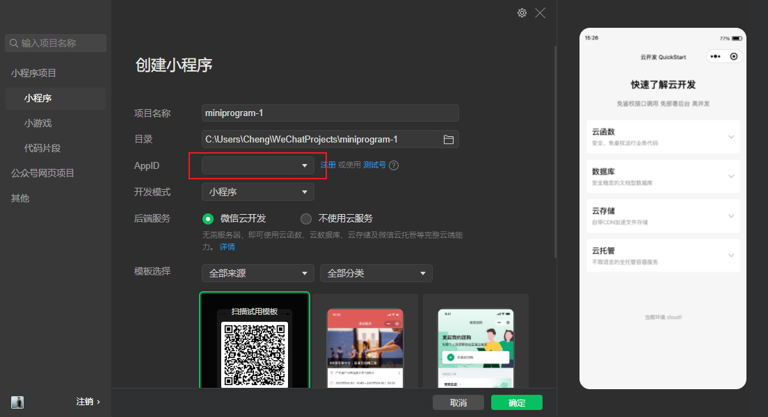安装好微信开发者工具并打开,创建1个小程序。或者已经有小程序的创建的时候输入appid。