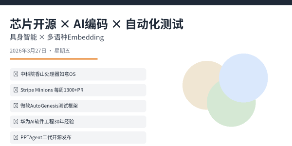 中科院发布开源RISC-V处理器"香山"与操作系统"如意",启动下一代芯片联合研发。Stripe部署自主编程智能体Minions,每周生成超1300个PR,形成人机协作闭环。微软开源AI自动化测试框架AutoGenesis,用自然语言生成跨平台测试代码。华为提出AI时代软件工程实践,通过确定性框架管理AI生成内容。中科院软件所开源本地幻灯片智能体PPTAgent第二代。